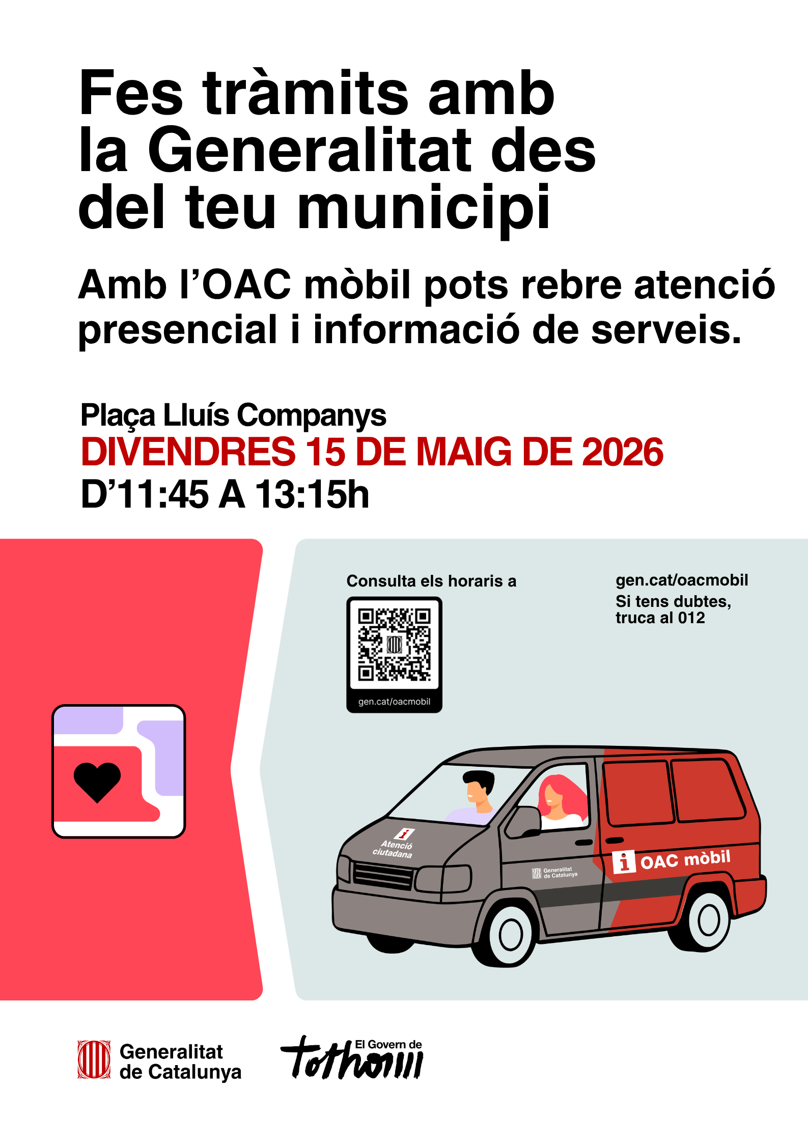 El proper divendres 15 de maig s’estrena el nou servei d’OAC mòbil de la Generalitat de Catalunya a Torrelles de Foix. Mensualment, s’instal·larà a la plaça Lluís Companys, d’11:45 a 13:15h per oferir atenció presencial i facilitar les gestions relacionades amb la Generalitat, com informació sobre serveis i tràmits, rebre suport per fer gestions en línia, o donar-se d’alta i configurar els sistemes d’identificació digital.